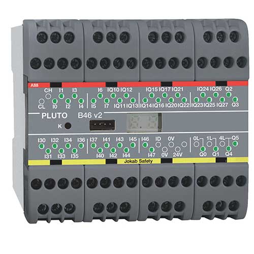 Safety PLC with Pluto safety bus. Totally 46 I/O 24 failsafe inputs + 16 non-failsafe outputs/failsafe inputs + 4 individually failsafe relay outputs + 2 individually failsafe transistor outputs.