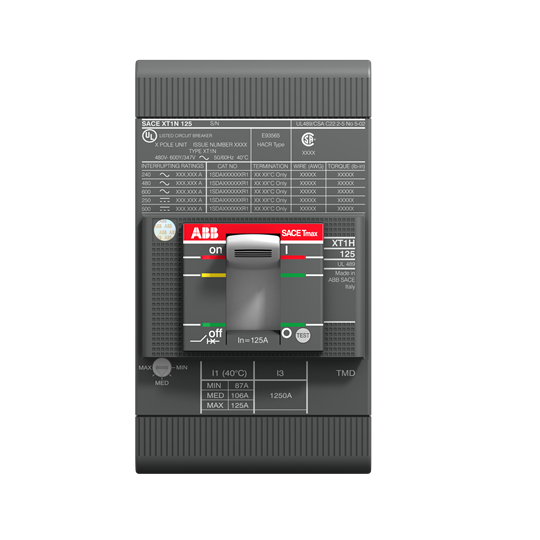 • Extended Description: Tmax Breaker Frame Size XT1N 125 Thermal Magnetic Fixed 60-600 Three-Pole Fixed + Front Flat Terminals Underwriters Laboratory/Canadian Standards Association